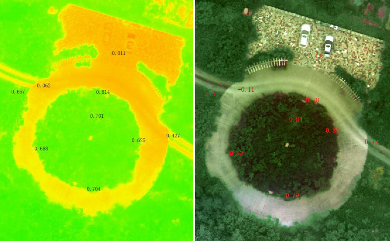 圖6 左圖為影像提取NDVI值 右圖為Spectrosense直接測定NDVI值