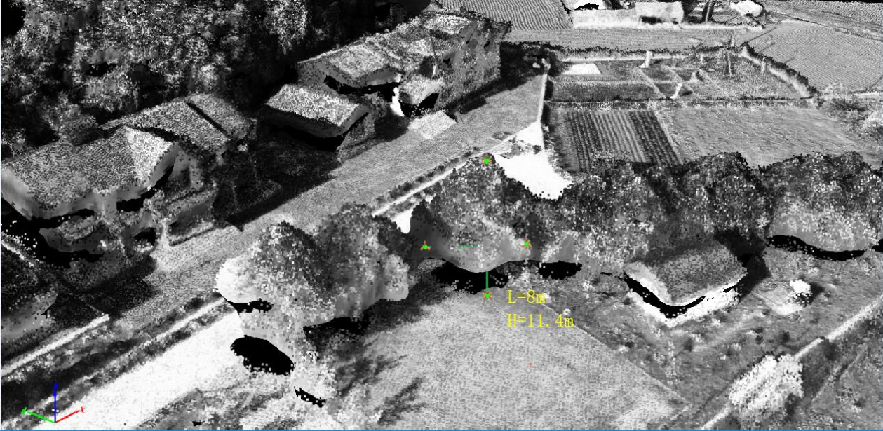 除光譜測量指數等專題數據之外,還可通過提取研究區三維點云數據,直接量取林木的冠層直徑、冠層周長、樹高、樹間距等三維信息,在林木高度測量及林分垂直結構信息獲取方面具有獨特的優勢。如下圖,所量樹高為11.4m,冠層直徑為8m。
