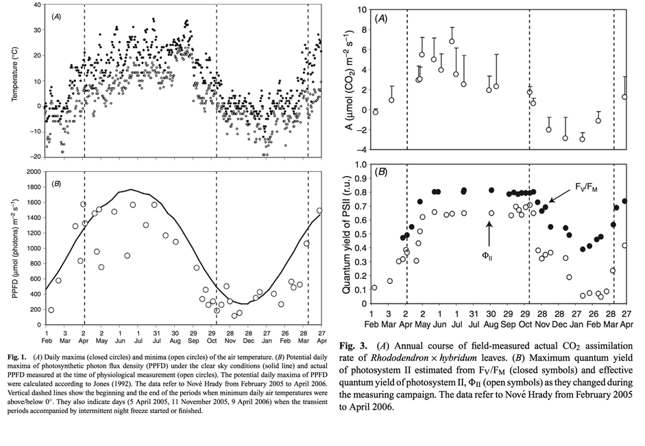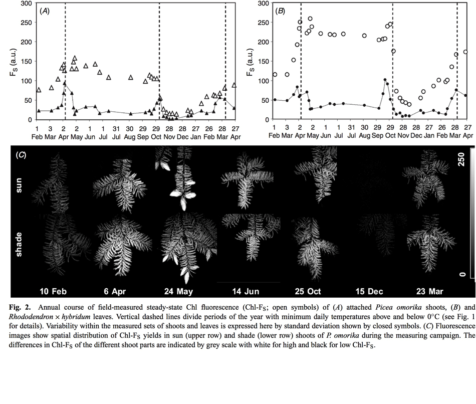 應用FluorCam葉綠素熒光技術,對野外植物進行原位不同季節長期監測,同時監測植物光合作用(CO2同化)A,結果參見下圖。FluorCam葉綠素熒光技術采用激發光脈沖調制技術、高靈敏度CCD傳感器(采樣頻率達每秒50次)技術及智能LED光源,可以大面積(標配每幀成像面積35x35cm)植物/作物成像分析,在野外既可在夜間進行暗適應條件下的葉綠素熒光成像分析,還可在環境光適應條件下進行葉綠素熒光成像分析,比簡單的激光誘導葉綠素熒光測量(通過一束點狀或線型單色激發光源激發葉綠素熒光并進行測量,優點是省電且可以更輕便)相比有諸多功能優勢,不僅測量參數多、可以進行各種葉綠素熒光實驗程序成像測量分析,而且一次二維成像(真正的成像分析)避免了點狀或線型激發光掃描造成的葉綠素熒光測量不同步、野外風吹草動分辨率嚴重降低等問題。