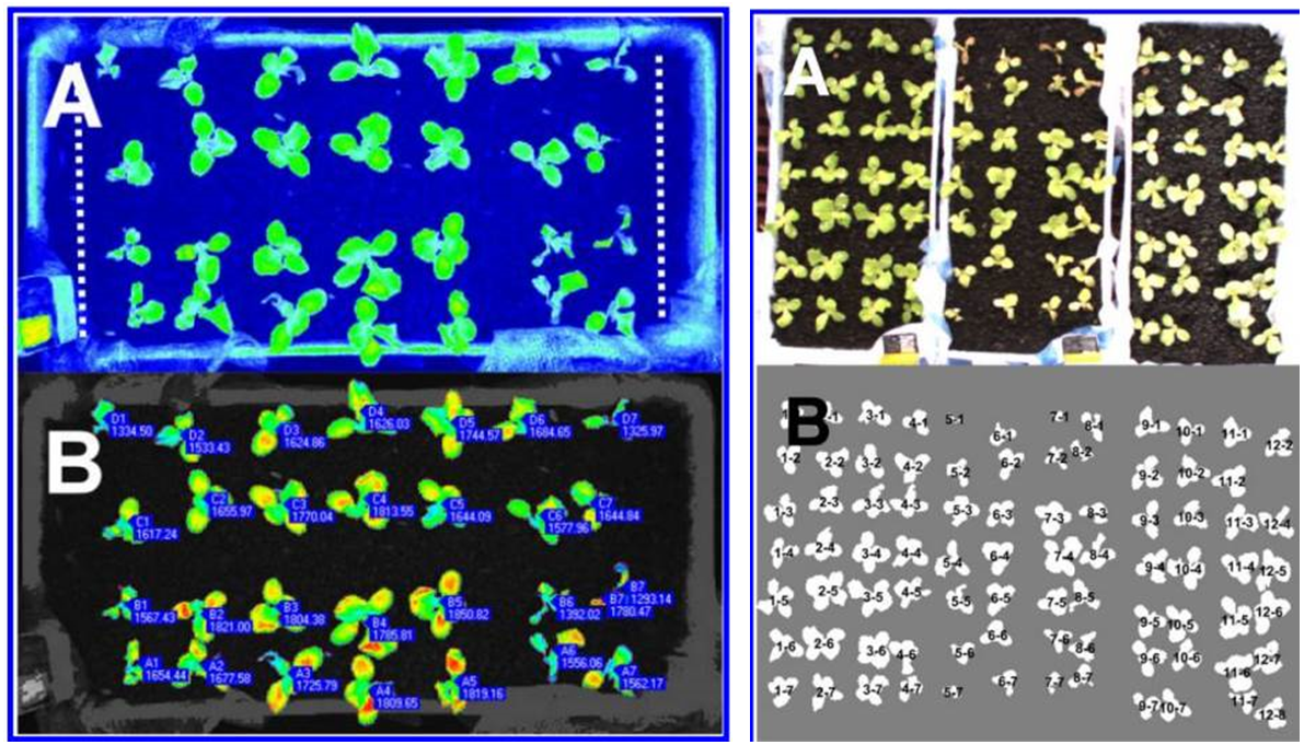 德國萊布尼茨蔬菜和觀賞植物研究所IGZ的Sandmann研究組將剛發芽的生菜幼苗人工感染立枯絲核菌(Rhizoctonia solani),然后綜合采用葉綠素熒光成像技術、多光譜熒光成像技術、紅外熱成像技術及植物反射光譜NDVI成像,對不同成像參數進行了分析,以確定哪些技術的哪些參數能夠更靈敏地將感染病害的植株和未感染的植株區分開,實現高通量非損傷在線分析測量篩選: