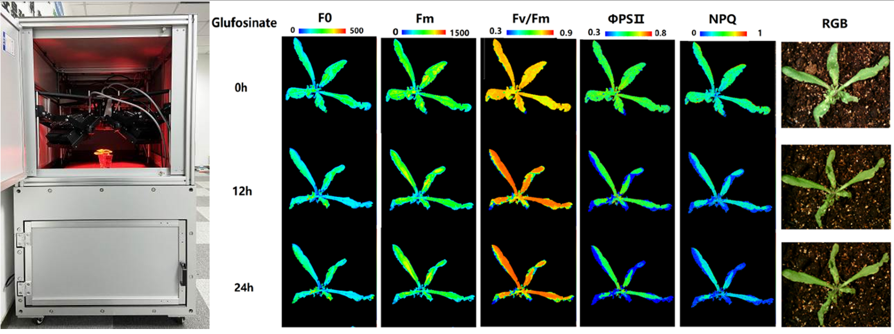 左圖為PhenoTron? PTS植物傳送至葉綠素熒光成像和高光譜成像站進行成像分析;下右圖為草銨膦對擬南芥光合生理影響(葉綠素熒光成像分析,由EcoTech?實驗室提供)