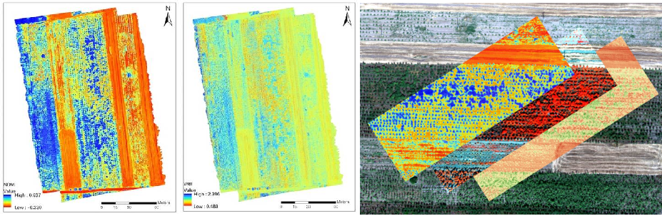 不同土地類型(人工林、新造人工林、收割后的麥田)高光譜數據處理部分結果,從左至右依次為歸一化植被指數、水波段指數、研究區專題圖疊加分析(背景底圖為RGB,從左至右依次為NDVI、NGB、PRI)
