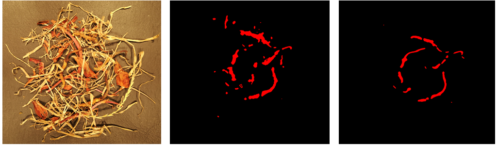 上圖中為運用SpectraScan-FX高光譜成像技術對黃芪和甘草的分類鑒定結果(紅色為甘草、綠色為黃芪),左圖為兩種飲片分類規則擺放,右圖為隨機混合擺放