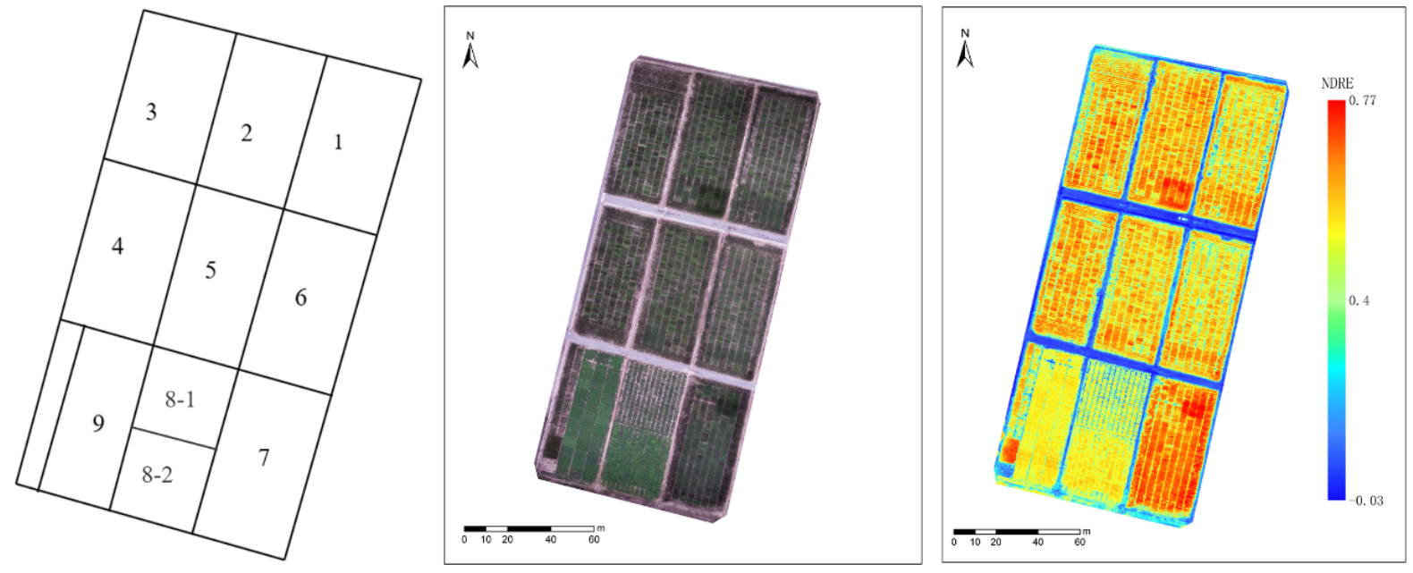 圖2 試驗田地塊編號、DOM、NDRE指數
