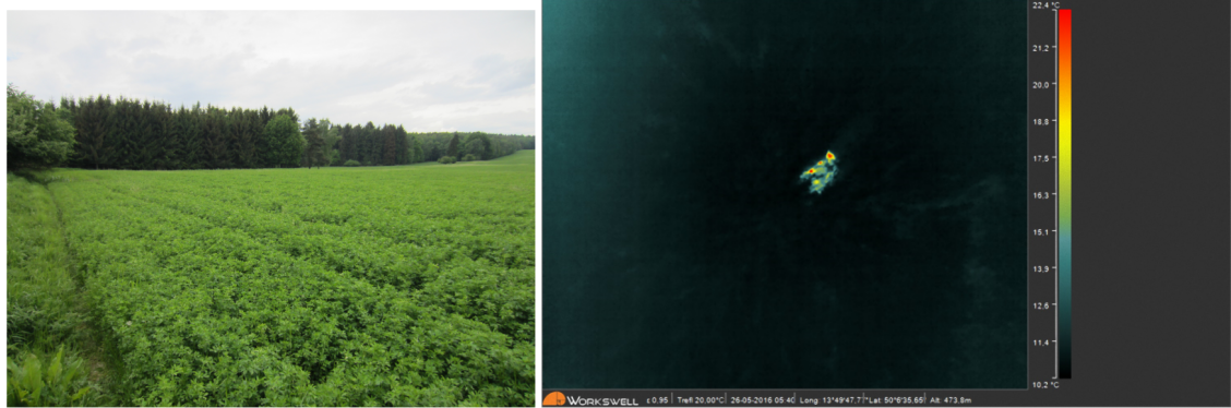 在一些生物多樣性較高或保護區內的農業用地上,許多野生動物幼崽常因在作物下層躲避天敵,而意外死于大型機械農耕活動。捷克的森林和獵場管理部門針對一片狍分布密集的苜蓿田開展了無人機紅外熱成像巡護研究。
