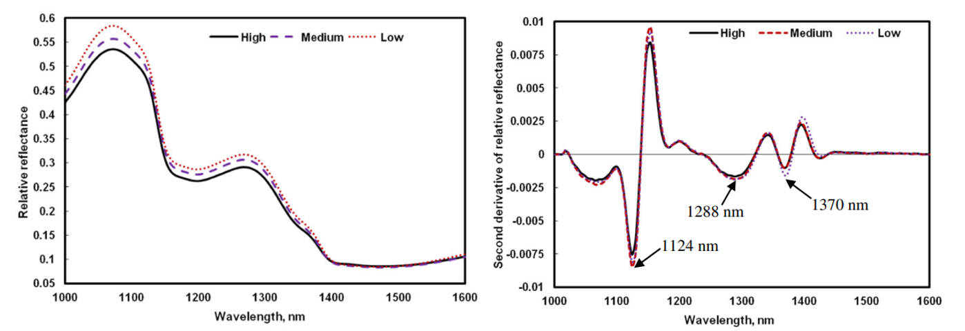右:1000-1600nm波段高中低辛辣程度青椒二階導數曲線