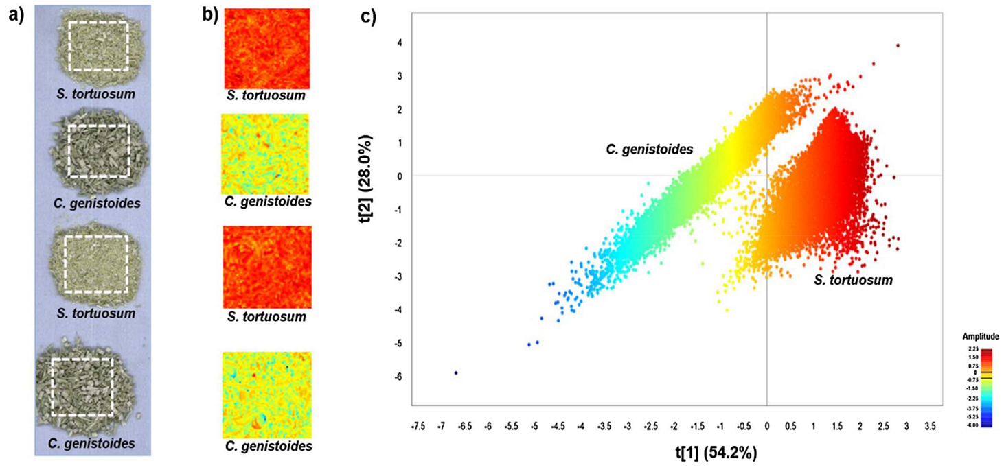 茨瓦尼科技大學研究人員使用SWIR高光譜成像采集了購買自Parceval Pty公司的原料(S.tortuosum和C.genistoides)和五批花草茶混合物(Honeybush-Sceletium)的高光譜圖像。在沒有相關化學知識的背景下,對兩種原料進行了全面無損的區分,主成分分析(PCA)顯示S.tortuosum和C.genistoides 原料之間存在54.2%的化學成分差異。