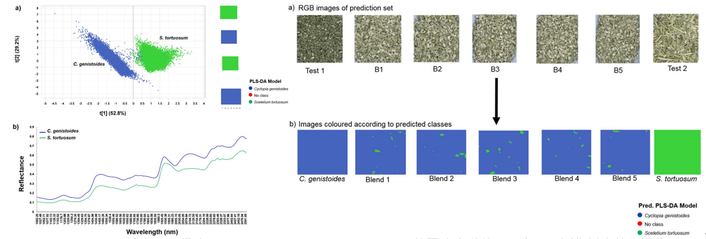 圖2.2 左:a) PLS-DA 散點圖及得分;b) S. tortuosum 和 C. genistoides 的平均光譜差異。右:預測集樣本的可視化,a) RGB 圖像;b) 基于PLS-DA模型的類預測