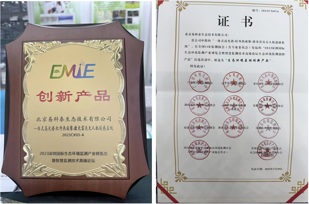 在博覽會開幕期間,“生態環境監測創新產品”評選結果隆重揭曉。經過前期申報、初步評選、及專家評選環節,由易科泰光譜成像與無人機遙感技術研究中心(西安)設計生產的Ecodrone?-LiHT一體式高光譜-紅外熱成像-激光雷達無人機遙感系統,以其創新性、集成化、技術先進性及卓越的表現,從眾多參選產品中脫穎而出,成功入選“生態環境監測創新產品”。此次獲獎是繼我司產品榮獲“后稷獎”及“儀器設備十大新銳產品”后,又一明星產品榮膺全國范圍內科技獎項。