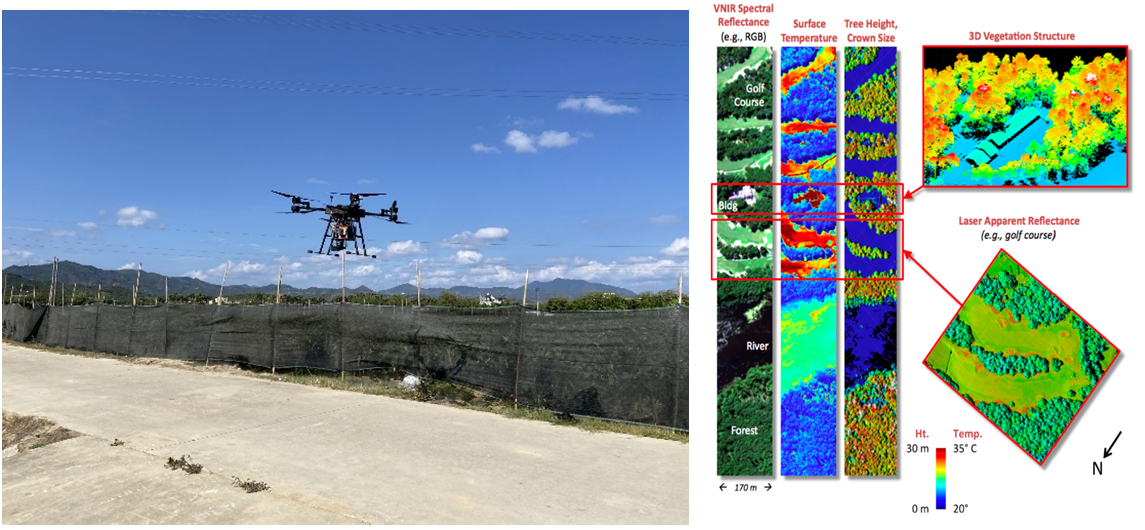 圖左:Ecodrone?- LiHT一體式高光譜-紅外熱成像-激光雷達無人機遙感系統;圖右:森林資源調查研究(引自Bruce D. Cook等,NASA Goddard’s LiDAR, Hyperspectral and Thermal (G-LiHT) Airborne Imager, Remote Sensing, 2013)